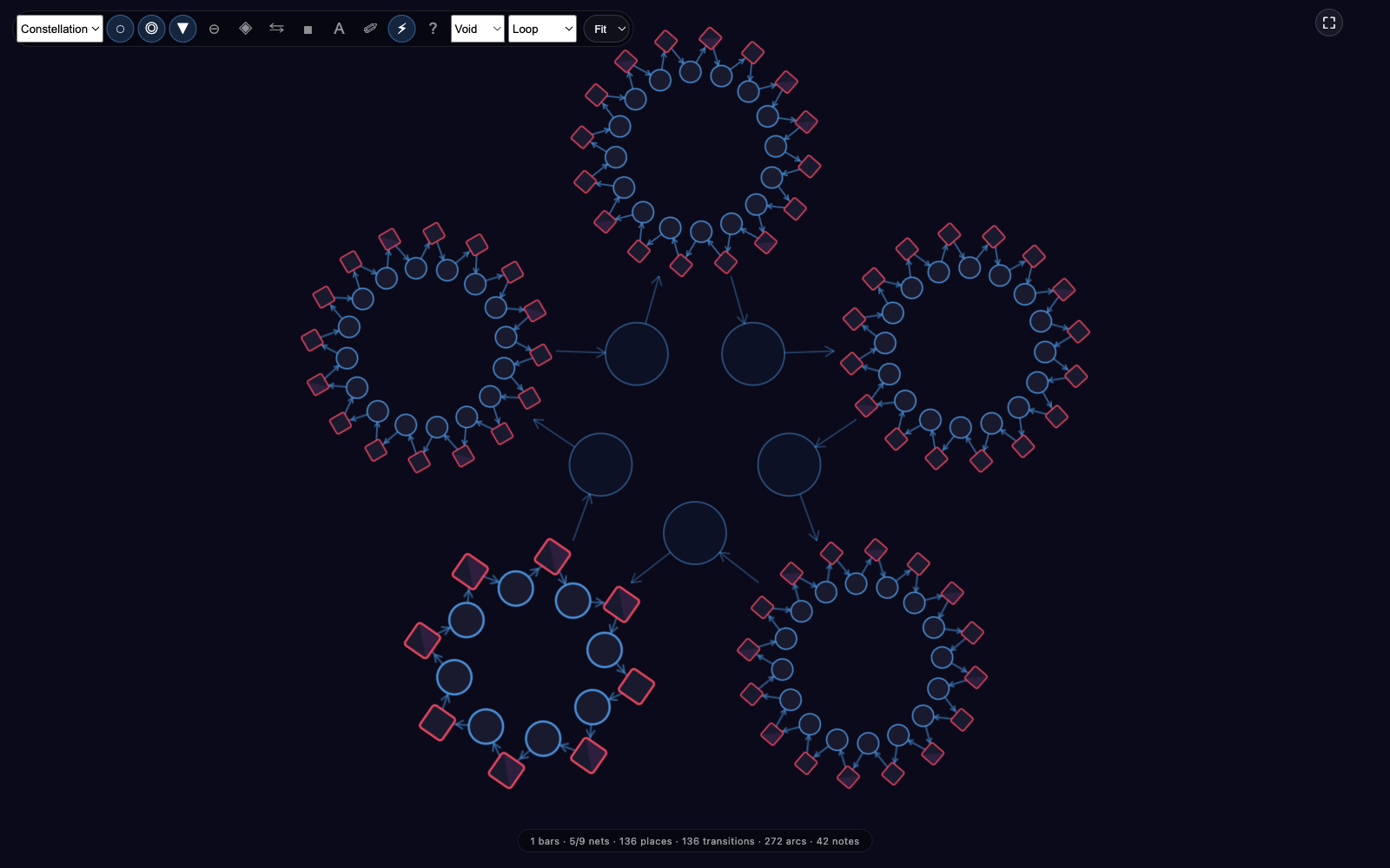 Press M. The whole app turns into a Petri-net display reading the same place/transition state the audio engine reads. Constellation mode shows nine sub-nets in a ring, each rendering the active variant for its slot, joined through central connector places. Beat particles pulse toward the centre on each fire.