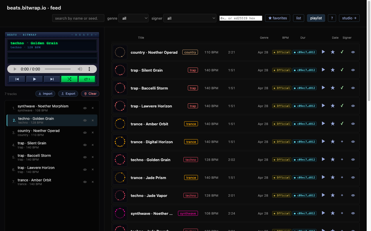 Every track on beats.bitwrap.io now has a content-addressed share URL. Click Share, copy the link, open it in any browser — the listener hears the exact same thing you were hearing: genre, seed, mix, FX, Feel, Auto-DJ settings, Fire-pad config, crop region, all of it.