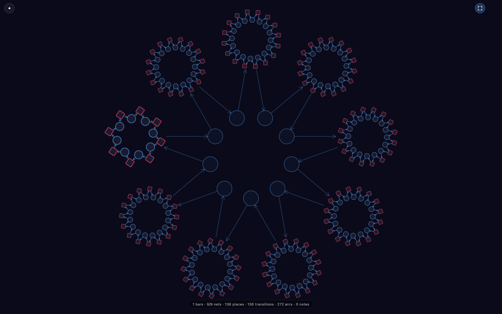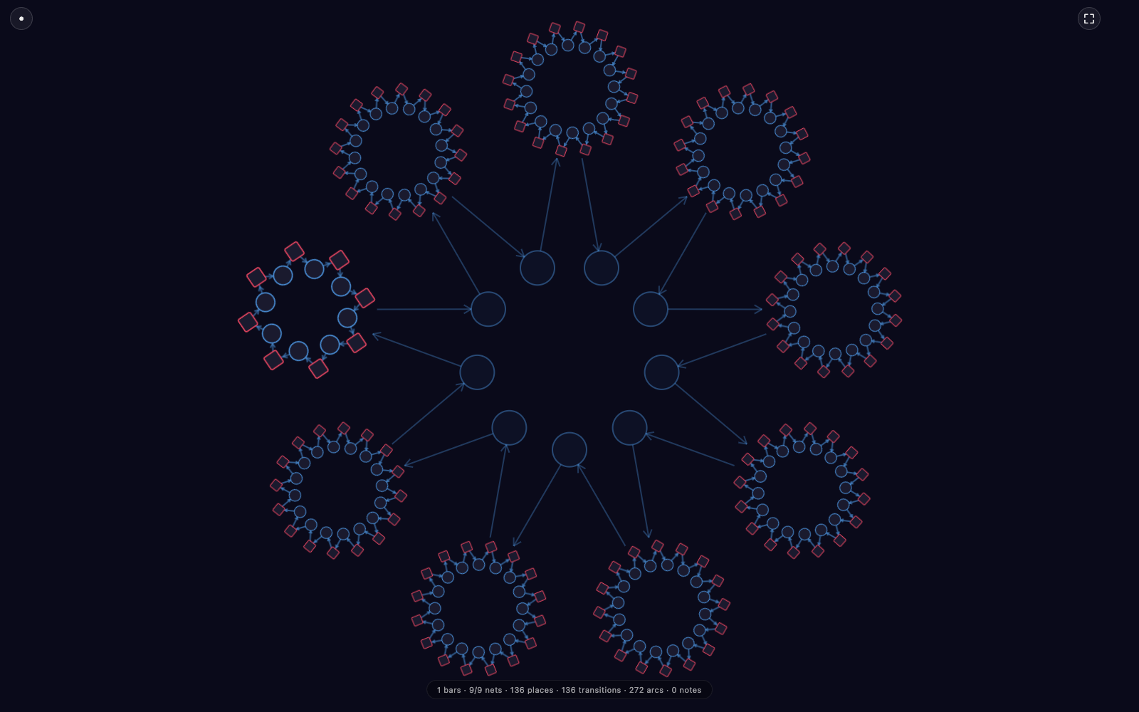 Press M (or hit the fullscreen button) and the whole app turns into a visualizer. Every unmuted track renders as its own live sub-Petri-net, arranged as a meta-Petri-net with connector place-circles and arrows between panels. It reads the same audio pipeline as the mixer; the visuals are a read-only projection of what's already happening.